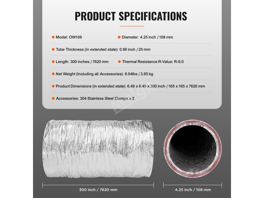 Izolovaná flexibilní hadice 101.6MM × 7.62M, 2 svorky, 3 vrstvy
