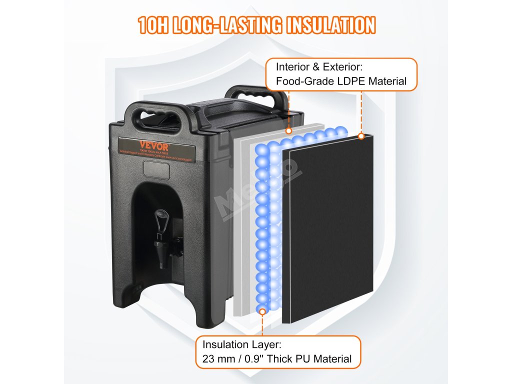 Ať už se jedná o džus, kávu, mléko nebo čaj, náš 2,5galonový (9,5l) nápojový automat zvládne vše - horké i studené. Je vybaven vnitřním a vnějším tělem z LDPE a 0,9 palce/23 mm silnou vrstvou PU pěny, která udrží vaše nápoje izolované po dobu více než 10 hodin. Ať už horký, nebo studený, má o vás postaráno!