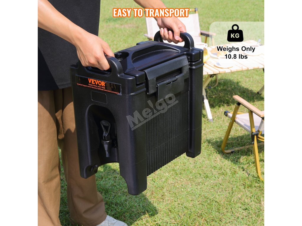 Náš termo dávkovač nápojů je vyroben z lehkých materiálů a váží pouze 4,9 kg. Dvě ergonomicky navržená integrovaná držadla zajišťují snadné přenášení pro 1-2 osoby.