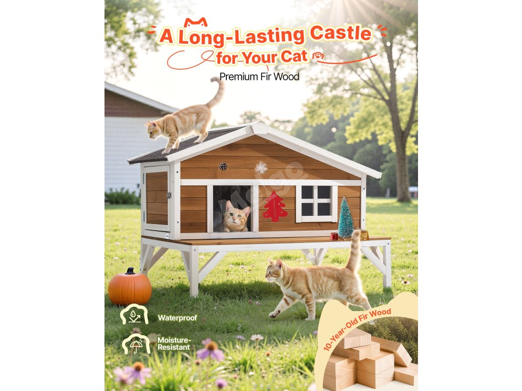 Tento vyvýšený kočičí domek má velké boční dveře, které jsou ideální pro větší kočky nebo rodiny s více kočkami. Vyvýšená plošina pro skákání poskytuje kočkám další prostor pro šplhání, zkoumání a vyhřívání na slunci.