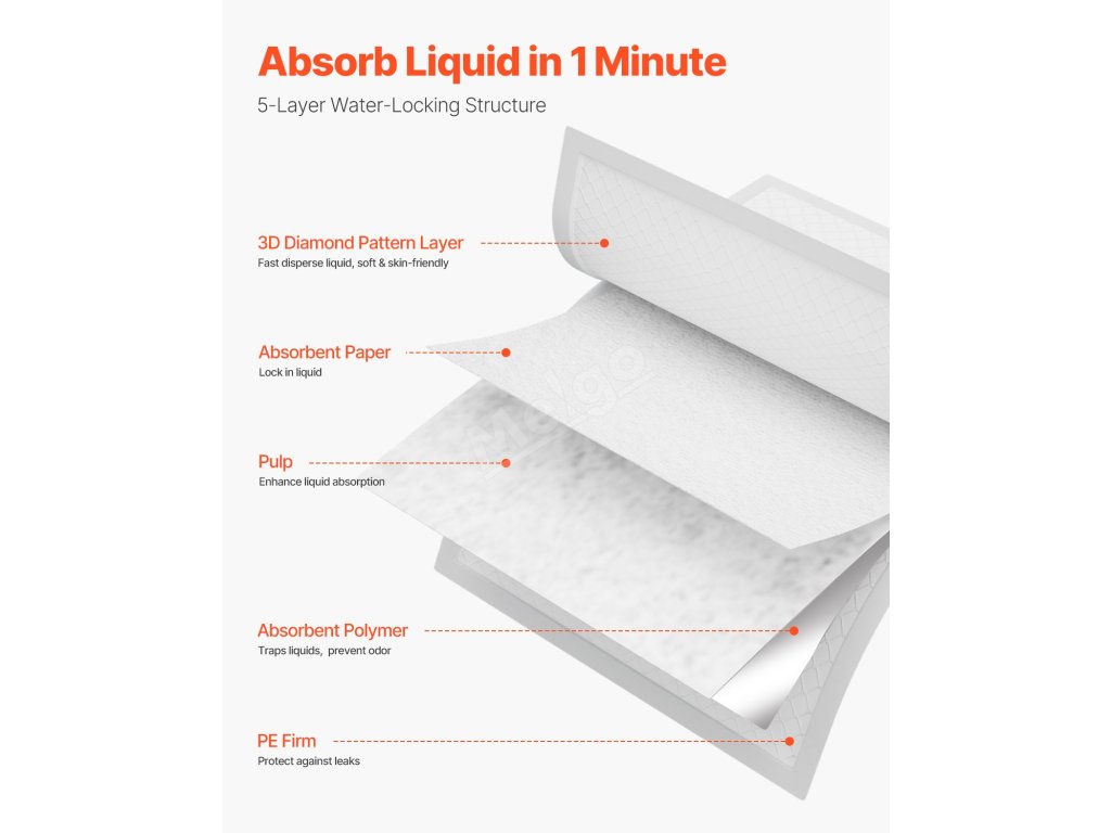 Udržujte se v suchu a pohodlí s našimi jednorázovými podložkami o rozměrech 30" x 36". Tyto podložky na lůžko s pětivrstvou ochrannou strukturou jsou extrémně savé, rychle zadržují tekutiny a udržují lůžka, pohovky a matrace v suchu. Jsou ideální pro děti, starší osoby, dospělé a domácí zvířata - stačí je použít a zlikvidovat pro snadné čištění.