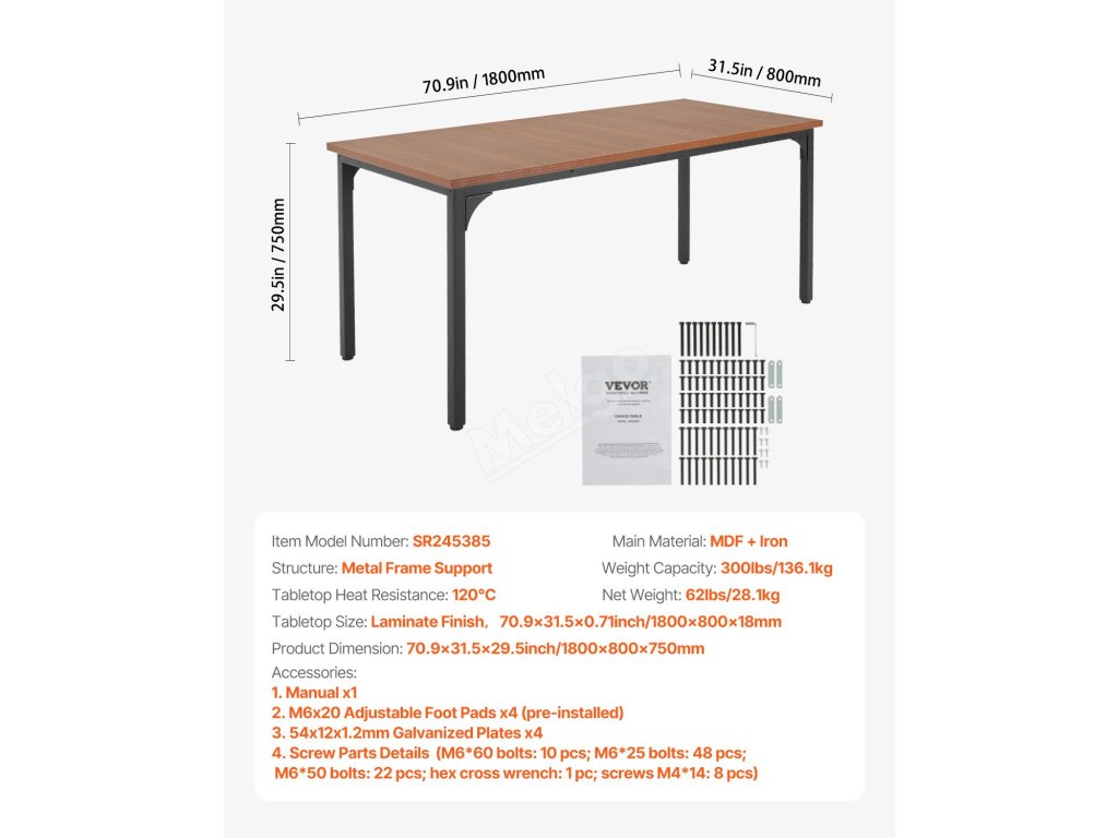 | Velikost desky stolu | Povrchová úprava laminátu,70,9x31,5x0,71 palce / 1800x800x18 mm |