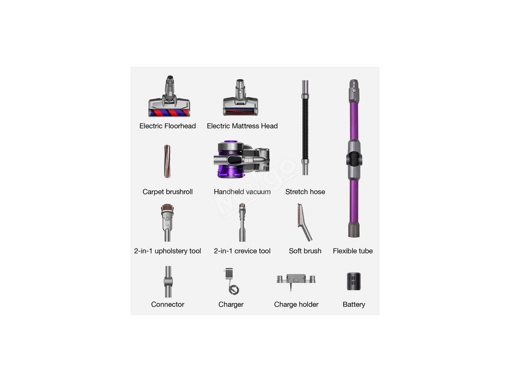 | Obsah balení: | Nabíjecí základna, Elektrická hlava na matrace, Nástroj na čalounění 2 v 1, Měkký kartáč, Kartáčový válec na koberce, Ohebná trubice, Napínací hadice, Štěrbinový nástroj 2 v 1, Koncentrátor, Kombinovaný kartáčový válec |
