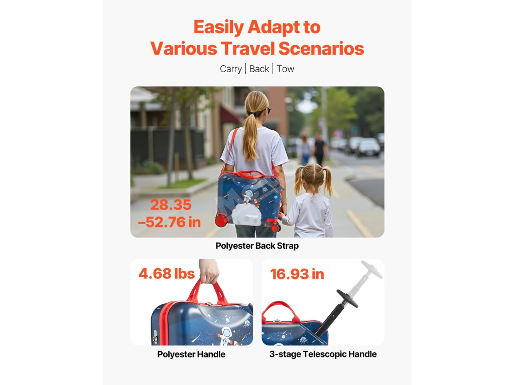 Díky rukojeti jsou krátké cesty hračkou, zatímco ramenní popruhy jsou ideální pro delší cesty. Díky nastavitelným funkcím se dětský kufr na kolečkách snadno ovládá jak rodičům, tak dětem, takže rodinné výlety budou ještě zábavnější!