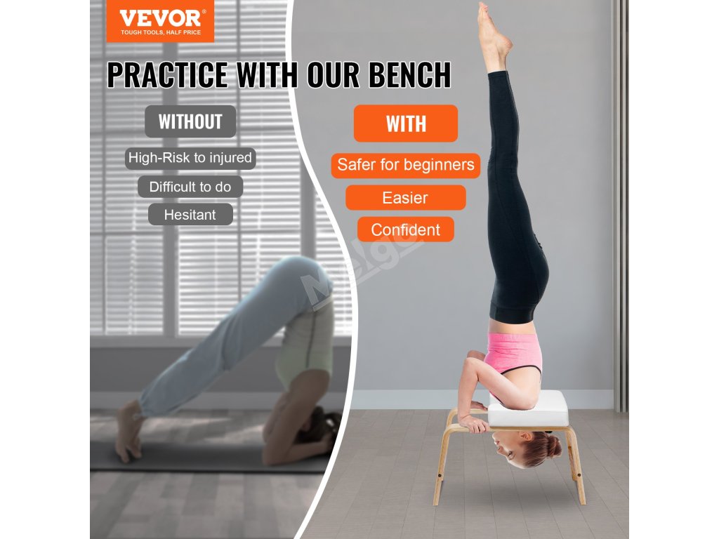 Jógová lavice pro stoj na hlavě je vybavena polštářem o tloušťce 2,55" (65 mm), který je navržen tak, aby snižoval zatížení krku a ramen.