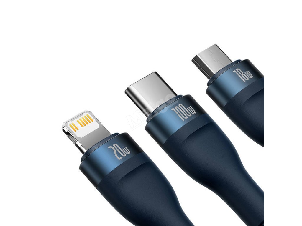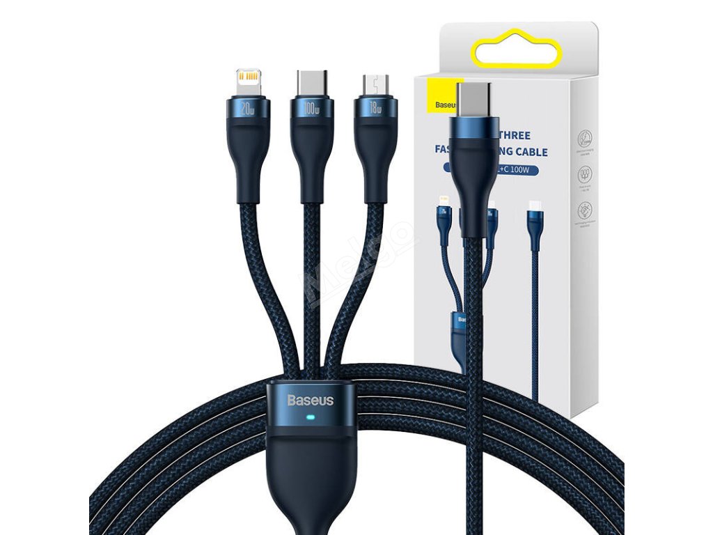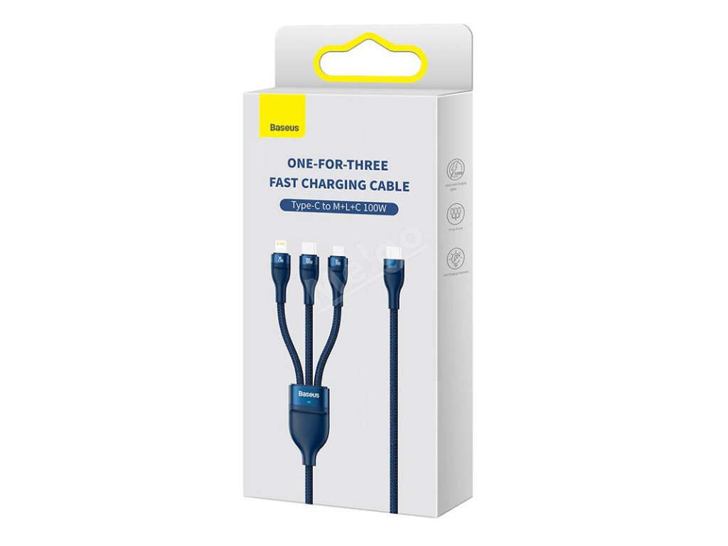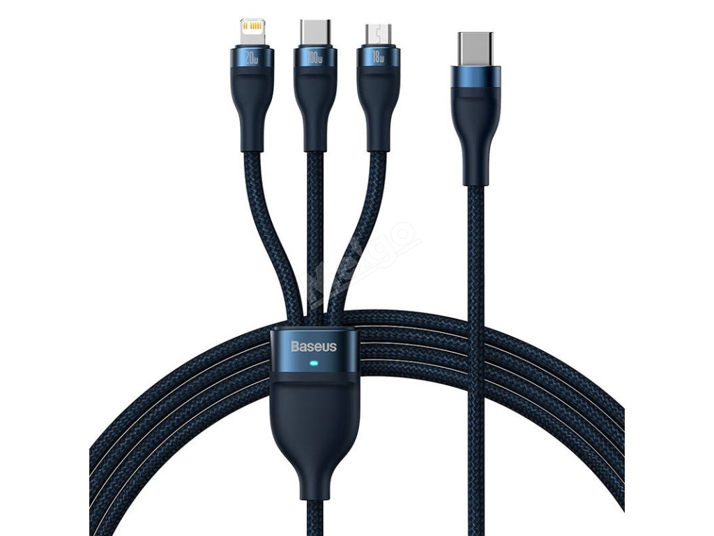Kábel USB 3v1 Baseus Flash Series 2, USB-C + micro USB + Lightning, 100 W, 1,5 m (modrý)