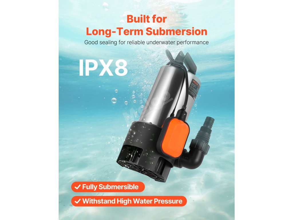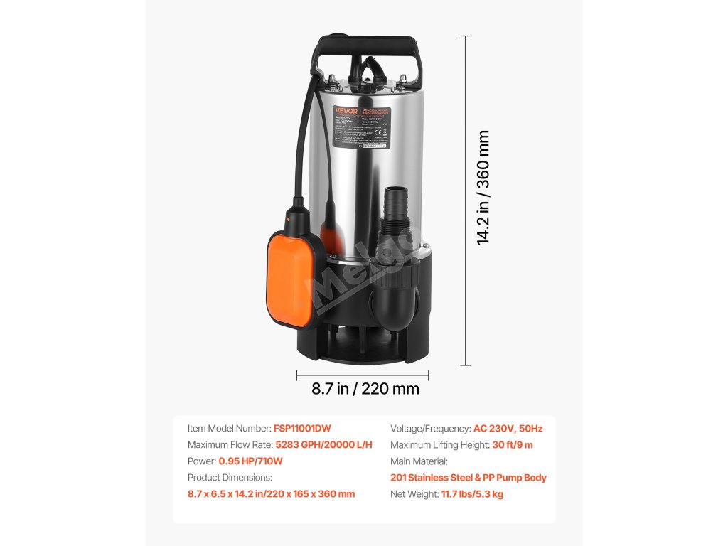 Toto 710W (0,95 HP) kalové čerpadlo poskytuje maximální průtok 20 000 l/h (5283 GPH) a maximální výtlak 30 stop (9 m). Díky pouzdru z nerezové oceli, vodotěsnosti IPX8 a plovákovému spínači poskytuje spolehlivý ponorný výkon. Zvládá náročné odvodňovací práce pro bazény, jezírka, zahrady atd.