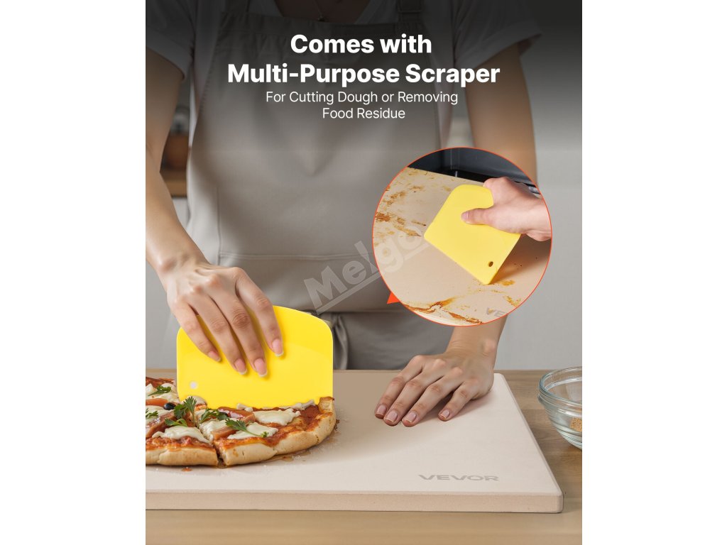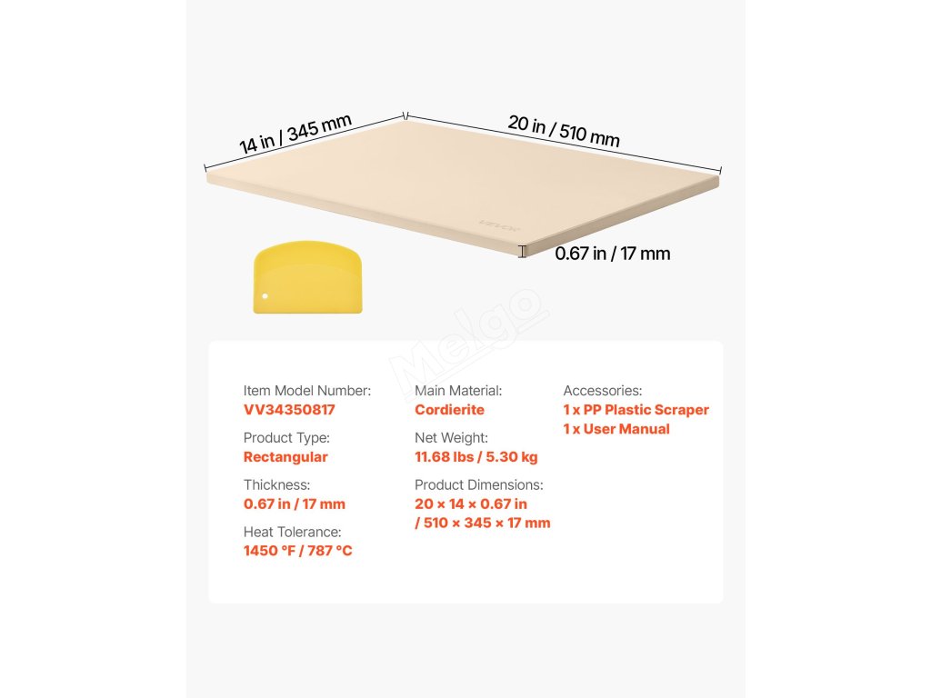 Obdélníkový kámen na pizzu je vyroben ze zesíleného kordieritu odolného vůči vysokým teplotám až 1450 °F/787 °C. Dokáže akumulovat teplo po dlouhou dobu a rovnoměrně vede teplo, čímž zabraňuje rozmočení pizzy a částečnému spálení a zvyšuje úspěšnost pečení.