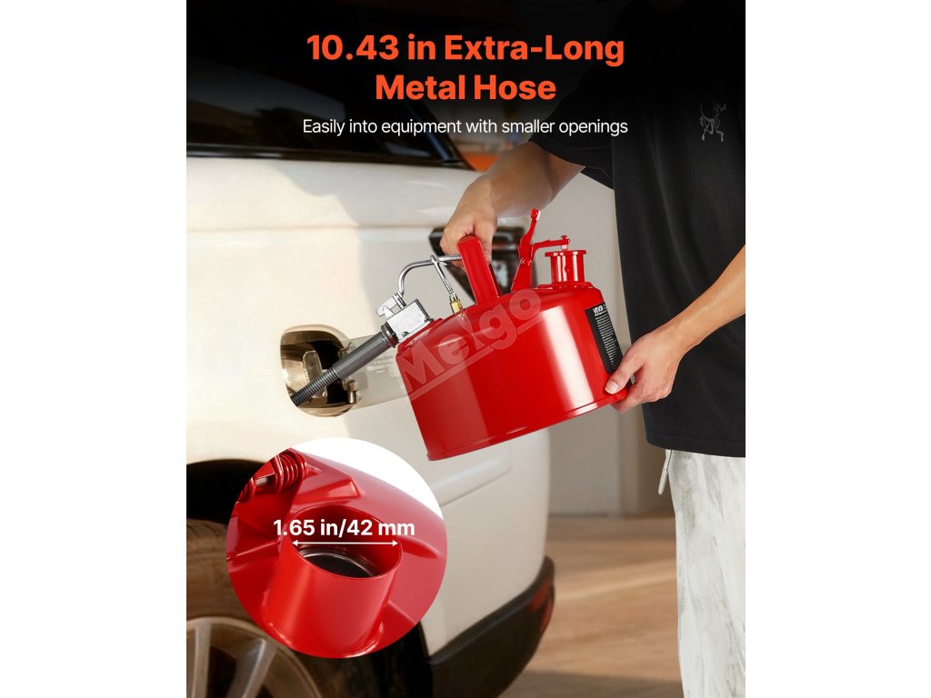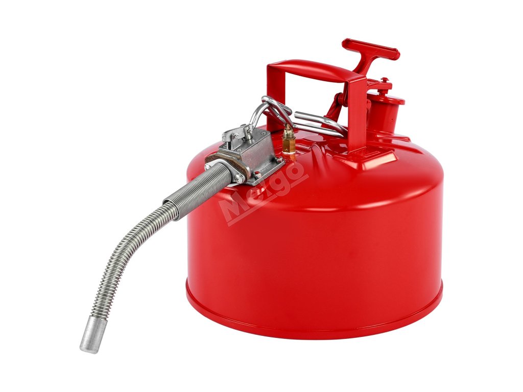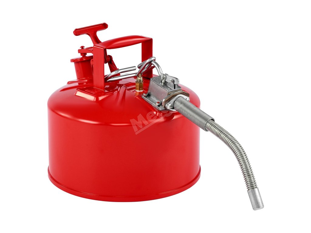 Ocelový plynový kanystr je vybaven přívodem oleje o průměru 1,65 palce/42 mm a kovovým vývodem s hadicí. Ve spojení s utěsněným a nepropustným pružinovým víkem zajišťuje přesné plnění a nalévání kapaliny. Víko se při převrácení automaticky uzavře a vytvoří těsný uzávěr, který zabraňuje úniku a rozlití kapaliny.