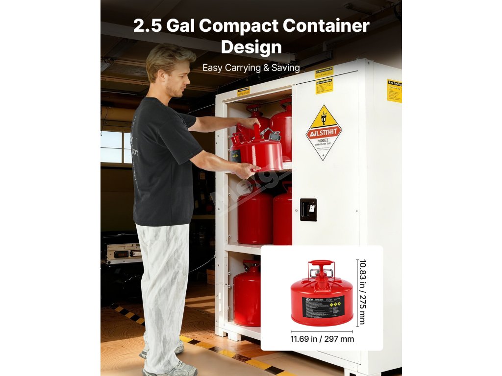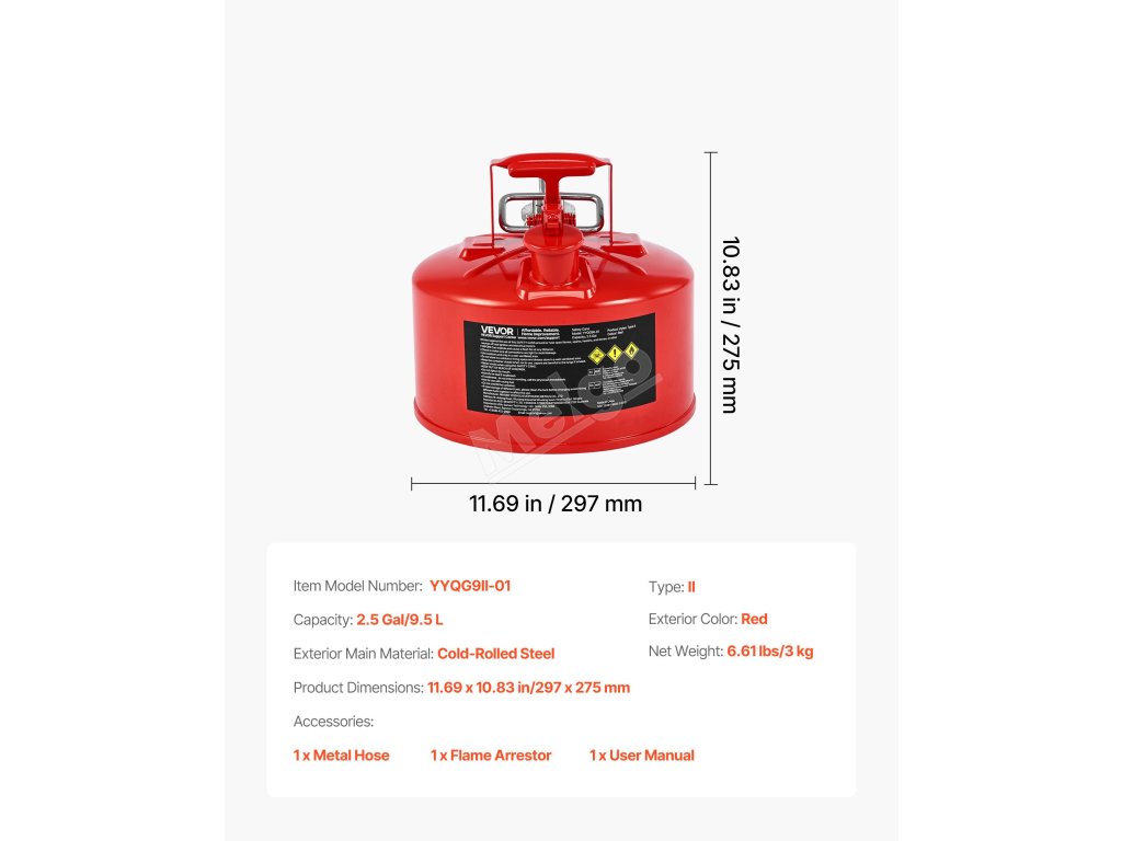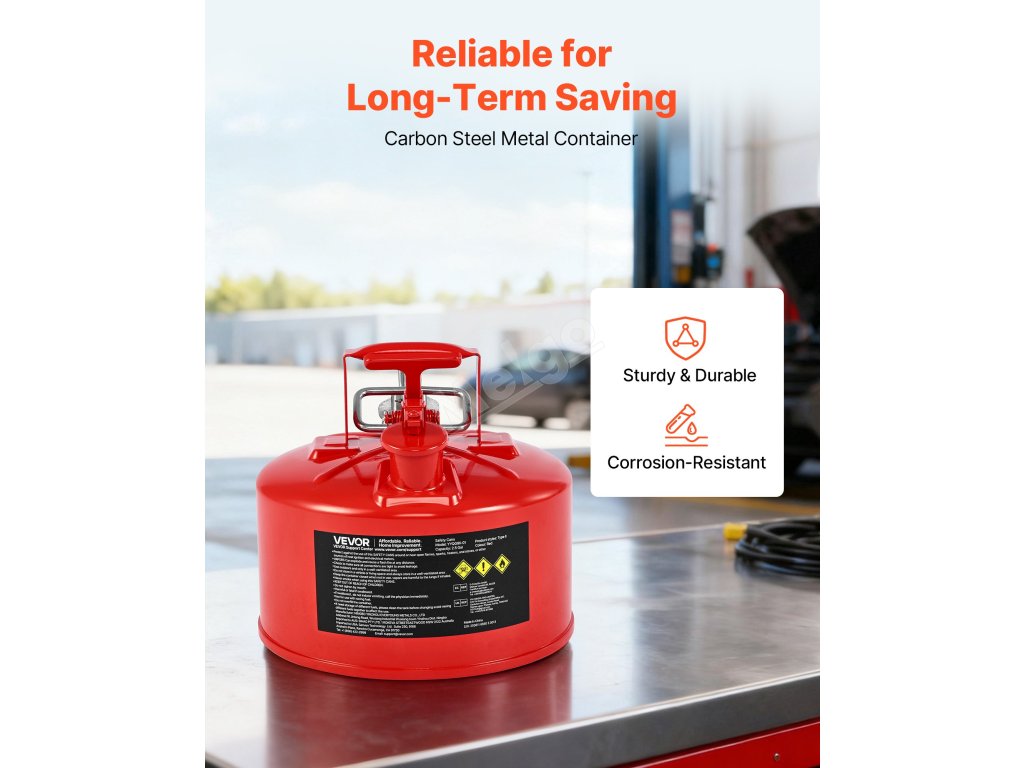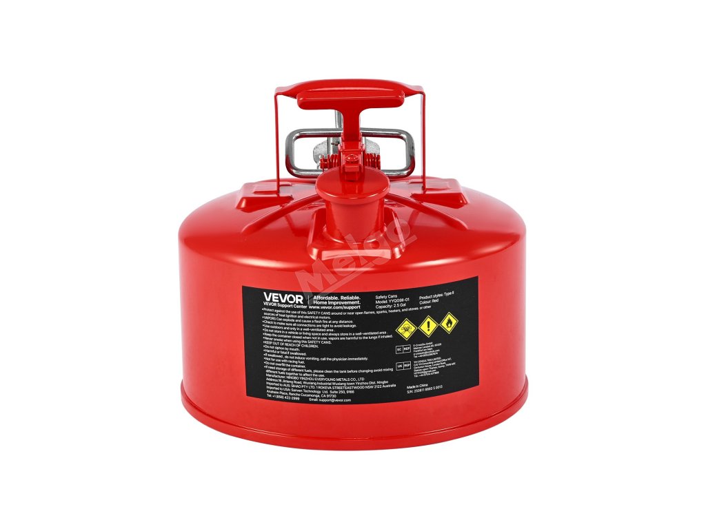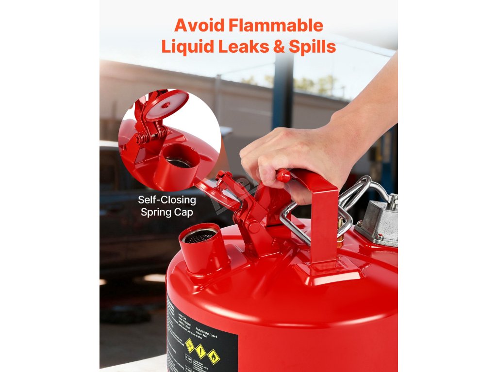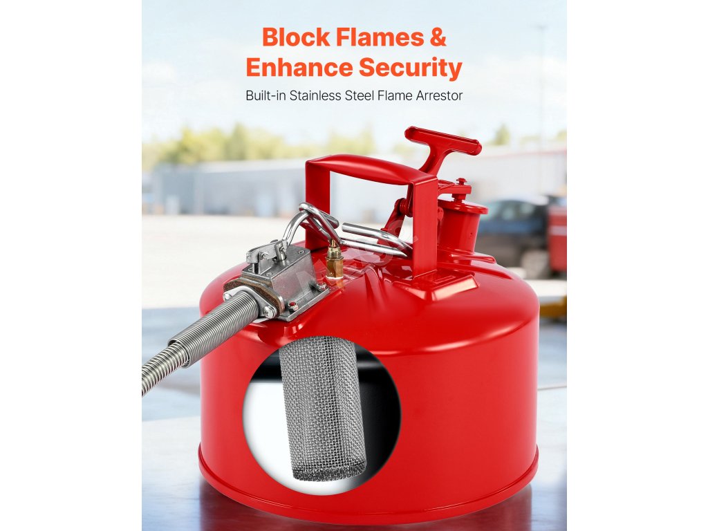 Náš 2,5 galonový červený bezpečnostní kanystr na plyn typu II má netěsné pružinové víko, které se při převrhnutí automaticky zavře. Její odolný kovový materiál je pevný a odolný proti korozi, včetně pojistky proti jiskrám, která blokuje vnější plameny, a přesné, hladké plnicí hadice.