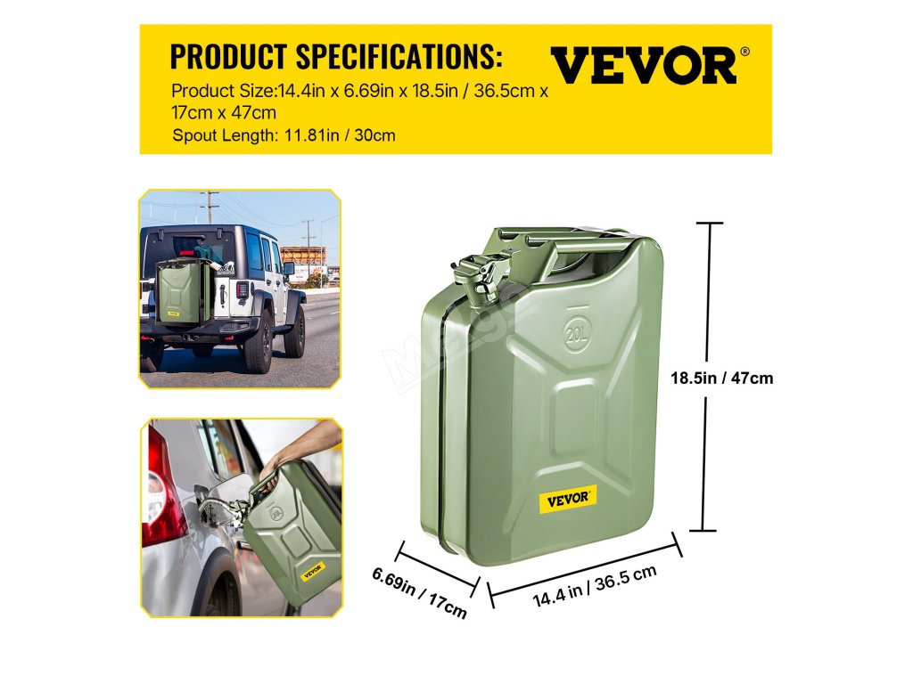 Díky velkému objemu 5,3 gal / 20 l je náš kanystr schopen pojmout dostatečnou zásobu paliva, abyste se dostali do cíle. Umístěte kanystr do svého vozidla a přestaňte se během dlouhých cest starat o ukazatel stavu paliva.