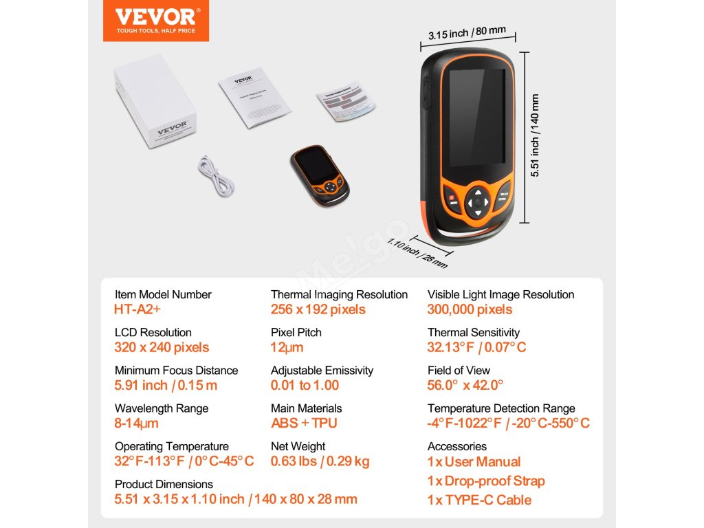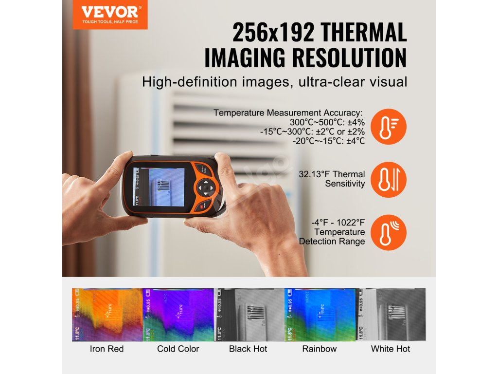 Kapesní termokamera VEVOR s působivým infračerveným rozlišením 256 x 192 poskytuje křišťálově čisté snímky pro přesné určení problémů. Díky 3,2" dotykovému displeji, připojení WiFi, obnovovací frekvenci 25 Hz a teplotnímu rozsahu -4℉ až 1022℉ je ideální volbou pro inspekce domů, vzduchotechniky a instalatérství.