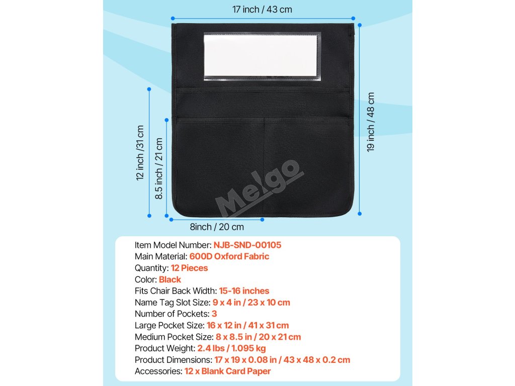 Udržujte pořádek na svých stolech s našimi kapsami na opěradlech židlí! Tato 12dílná sada je vhodná do tříd a je skvělým dárkem. Hodí se na židle o průměru 15-16 palců, což je ideální pro žáky 6.-12. tříd, aby měli na svých židlích pořádek.