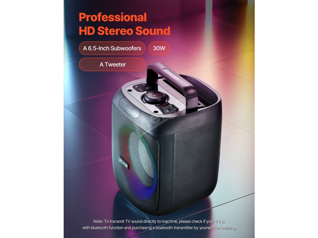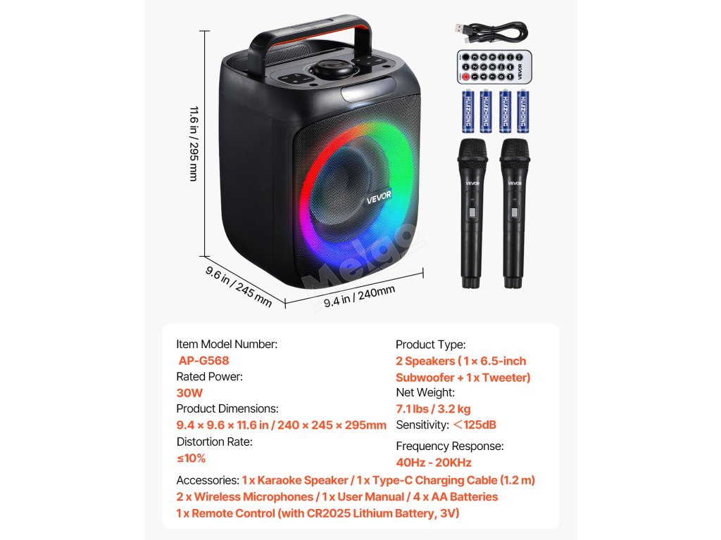 Karaoke systém 30 W, 6.5-inch bluetooth, 2 bezdrátové mikrofony, led