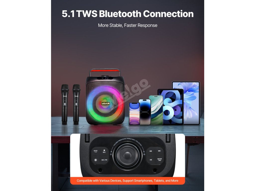 Vychutnejte si okamžité párování a stabilní přenos díky technologii Bluetooth 5.1.Náš karaoke přístroj podporuje také karty Micro TF, vstupy USB a AUX, takže je kompatibilní s telefony Android, televizory, iPady, tablety, počítači, projektory a dalšími zařízeními podporujícími technologii Bluetooth.