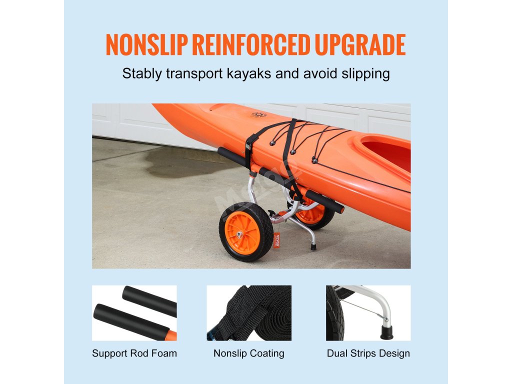 Kajakársky vozík VEVOR má protišmykovú podpornú nohu. Tá zabezpečuje bezpečnú a stabilnú prepravu. Protišmykový mechanizmus zabraňuje pohybu vozíka. Poskytuje bezkonkurenčnú stabilitu. Svoj kajak môžete ľahko prenášať bez obáv. Naša konštrukcia kajaku zabraňuje skĺznutiu vozíka na nerovnom povrchu. Protišmyková konštrukcia poskytuje bezpečné uchytenie. Táto funkcia je dôležitá pre bezpečnú prepravu vďaka jeho robustnej konštrukcii. Protišmyková oporná noha je spoľahlivým doplnkom. Váš kajakársky vozík VEVOR zaručuje stabilitu na každom kroku.