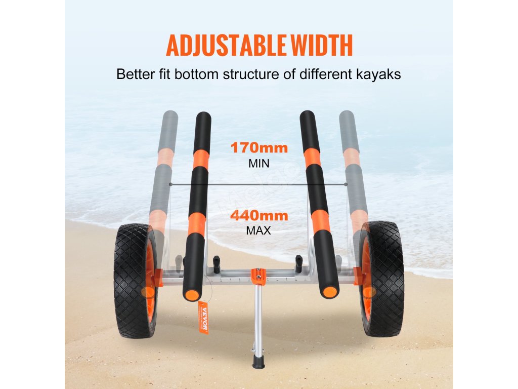Môžete ľahko prepínať medzi loďami a nastaviteľná šírka zvyšuje flexibilitu, vďaka čomu je tento kajakársky vozík vhodný pre rôzne potreby kajakárov. Kajakársky vozík VEVOR je univerzálnym riešením pre všetky typy lodí.