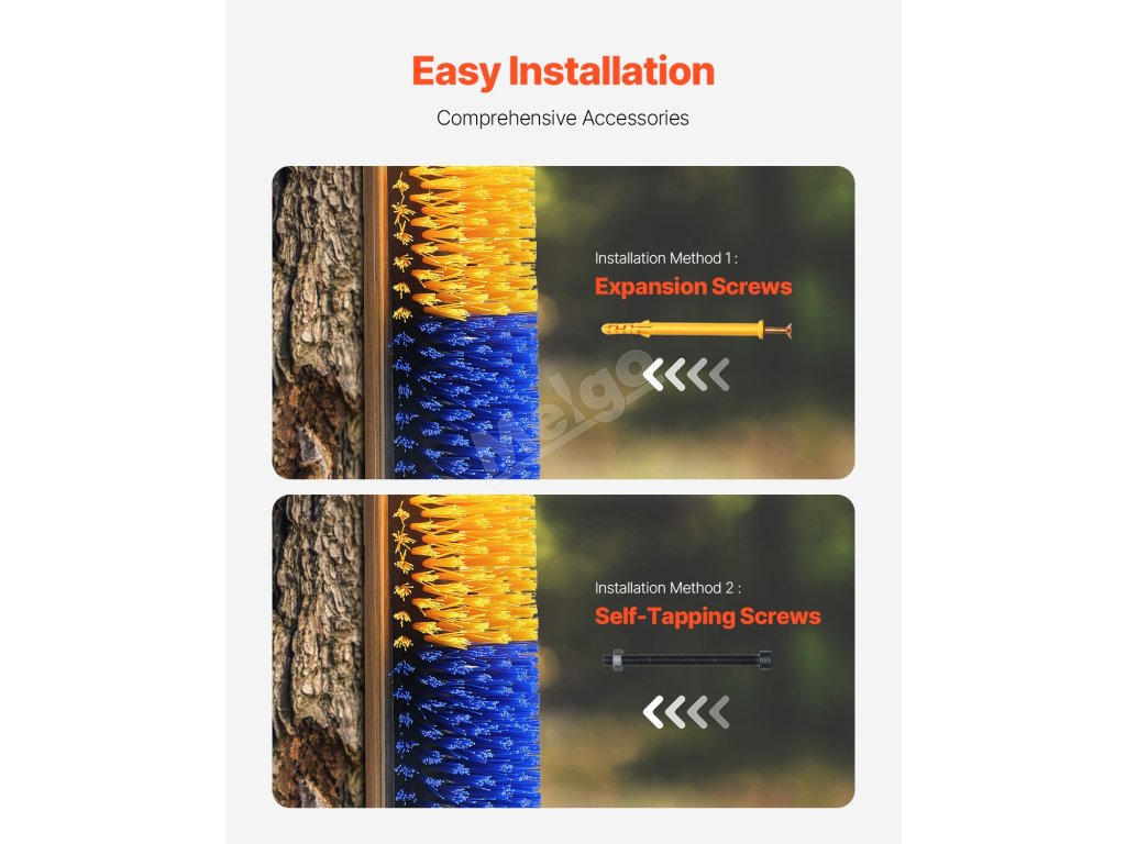 Vybavená dvoma sadami skrutiek - skrutkami a maticami, rozpernými skrutkami a samoreznými skrutkami - ponúka všestranné možnosti inštalácie. Kefa proti poškriabaniu hospodárskych zvierat zostáva pevne na svojom mieste aj pri intenzívnom používaní.
