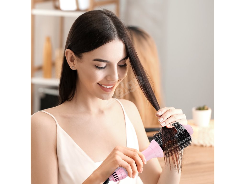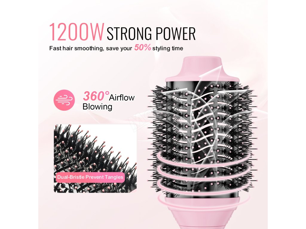 Vychutnejte si hladký účes bez námahy díky 360° prostorovému proudění vzduchu, které dodává rovnoměrné teplo a omezuje krepatění vlasů. Dvě hlavy kartáče jsou vybaveny nylonovými kolíky a zacuchané štětiny zabraňují zamotávání.