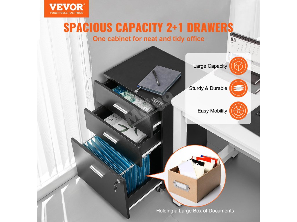Kartotéka 3 zásuvky, dřevěná, se zámkem, pro A4, 5 koleček, černá