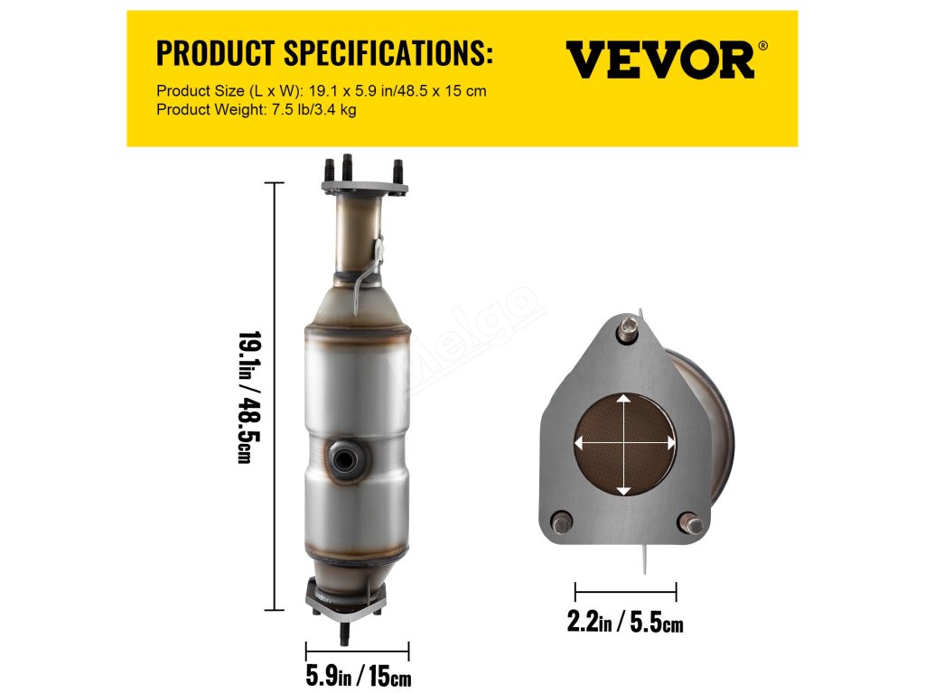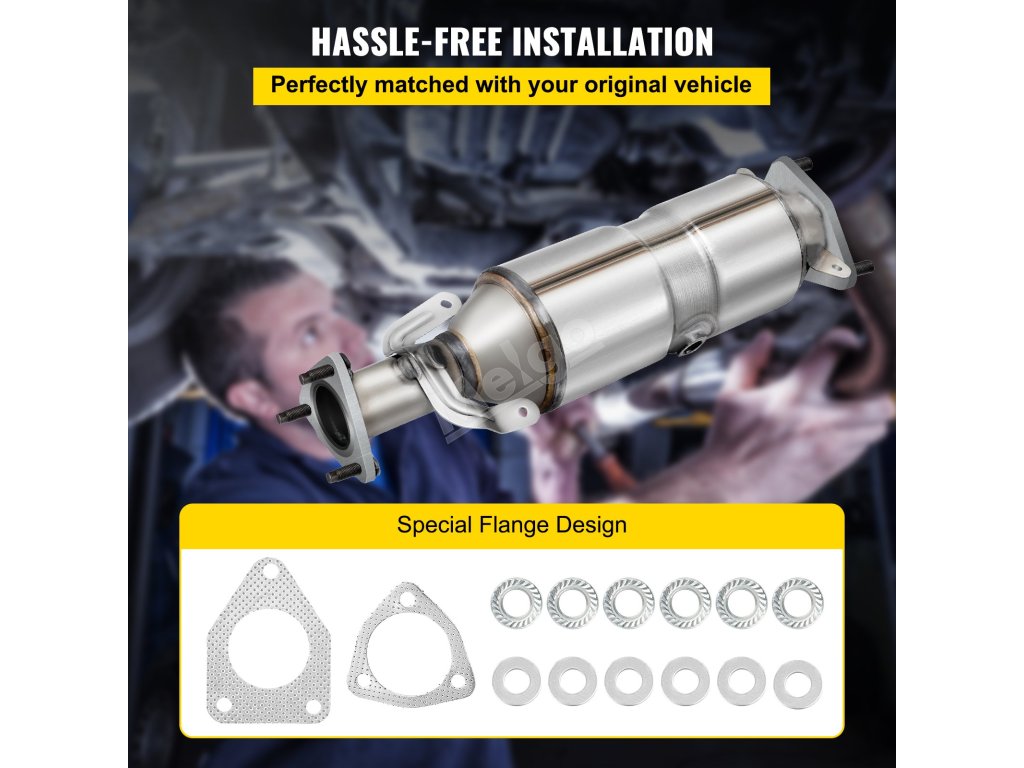 Tento katalyzátor s volným průtokem je vybaven šroubovými spoji a přírubovou konstrukcí pro bezproblémovou instalaci. Dodává se také s kompletním příslušenstvím, jako jsou těsnění a hardware, které usnadňují výměnu.