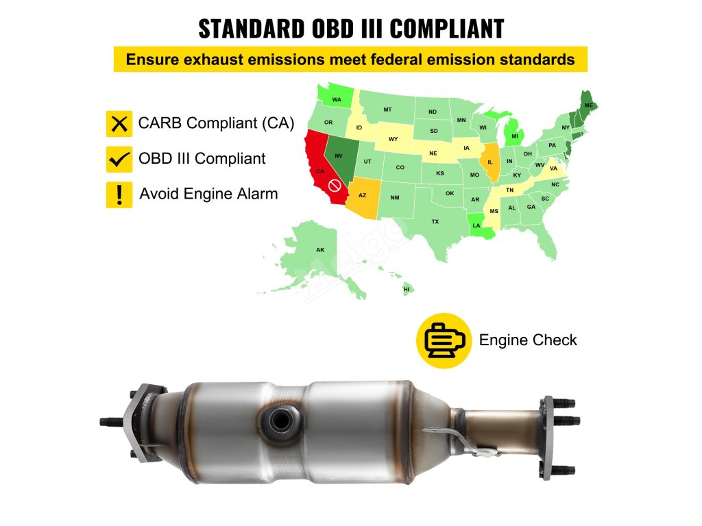 Katalyzátor s přímou montáží splňuje normy OBD III, nikoli však normy CARB. Lze jej tedy používat ve většině států kromě Kalifornie, není však legální pro použití ve vozidlech, která musí splňovat emisní normy Kalifornie.