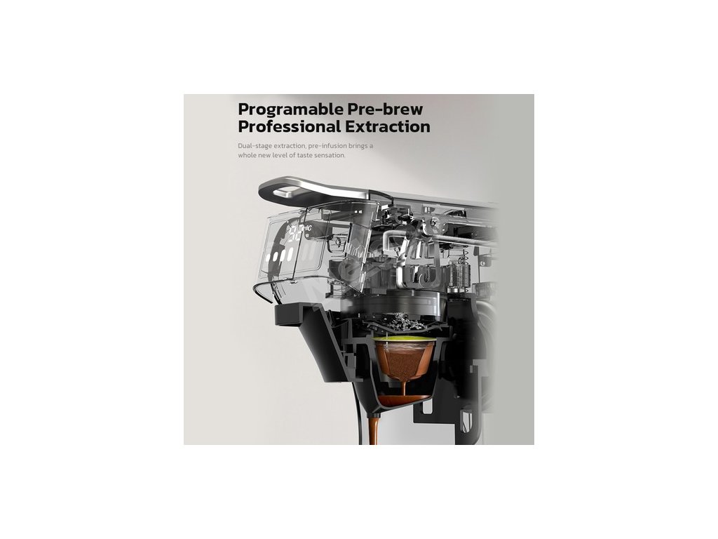 Kávovar na jeden šálek kávy se automaticky vypne po 15 minutách, pokud není používán, takže se nemusíte obávat, že zapomenete vypnout napájení. Funkce Anti-dry účinně chrání součásti kávovaru a zajišťuje bezpečnou extrakci kávy.