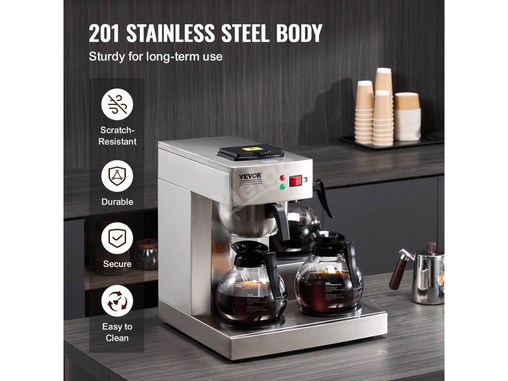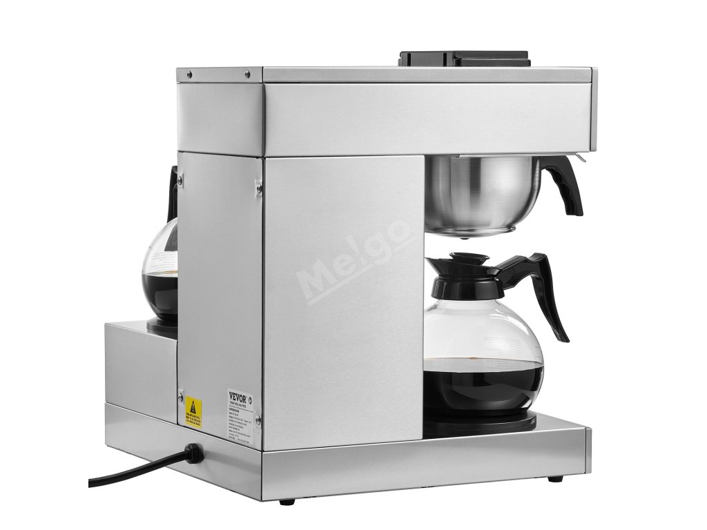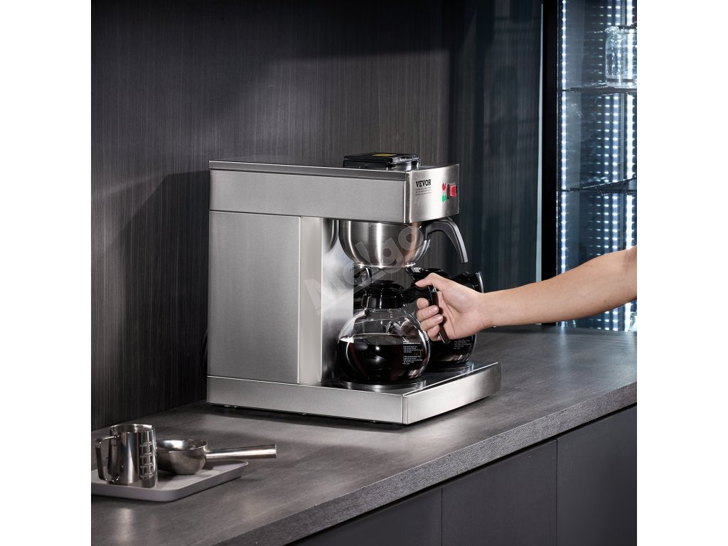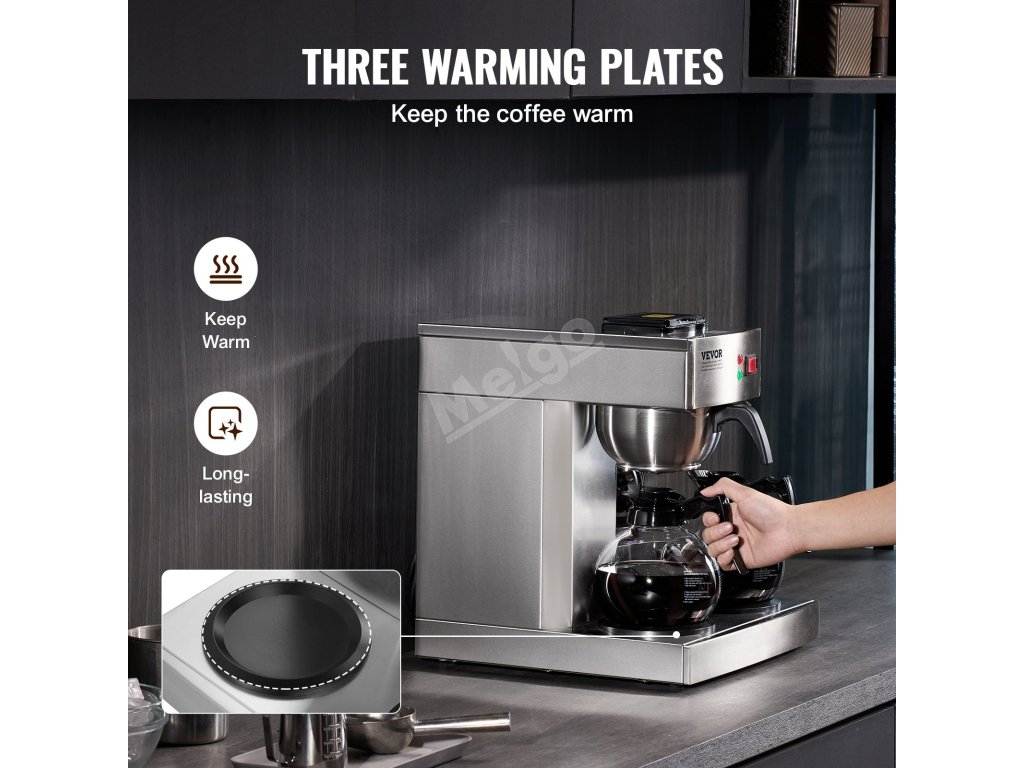 Tento komerční kávovar je vybaven dvěma topnými deskami a během provozu udržuje 3 skleněné karafy teplé, takže máte kdykoli k dispozici horkou kávu.
