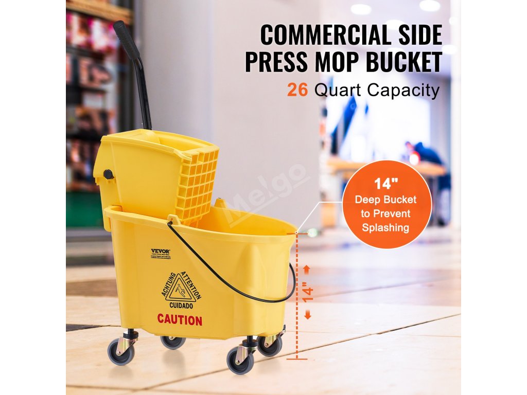 Boční ždímání komerčního kbelíku na mop umožňuje bezproblémové vyždímání vody, čímž se zajistí úplné odstranění vlhkosti a nečistot a rychlé vysušení podlahy.
