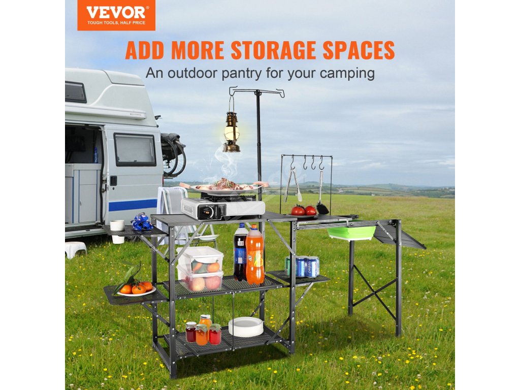 Kempingový kuchynský stôl VEVOR je skonštruovaný tak, aby vydržal. Jeho odolná konštrukcia z hliníka a železa odolá rôznym poveternostným a terénnym podmienkam. Dážď, slnko alebo vietor, tento stôl zostane pevný a spoľahlivý počas vašich dobrodružstiev. Vďaka svojej konštrukcii zvládne rôzne terény a poskytuje stabilný povrch na varenie a iné činnosti. Stôl má nosnosť 88 kg na doske a 48,5 kg na policiach, čo zaručuje, že je dostatočne pevný pre všetky vaše kempingové potreby a zároveň bude aj naďalej dobre vyzerať a fungovať v priebehu času.