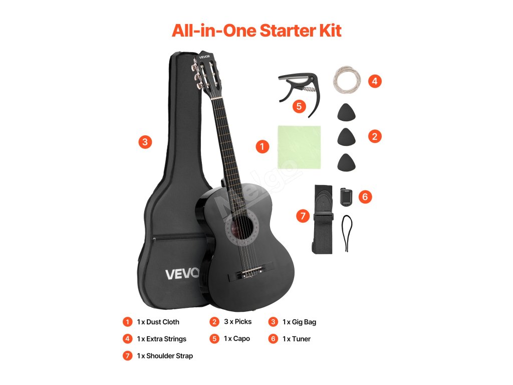 Odpověď Každá kytara je dodávána s kompletní sadou potřeb pro začátečníky: kytarovou taškou, utěrkou proti prachu, náhradními strunami, popruhem, kapodastrem, digitální ladičkou a 3 trsátky. Jedná se o kompletní sadu pro začátečníky - ideální pro začínající hráče.