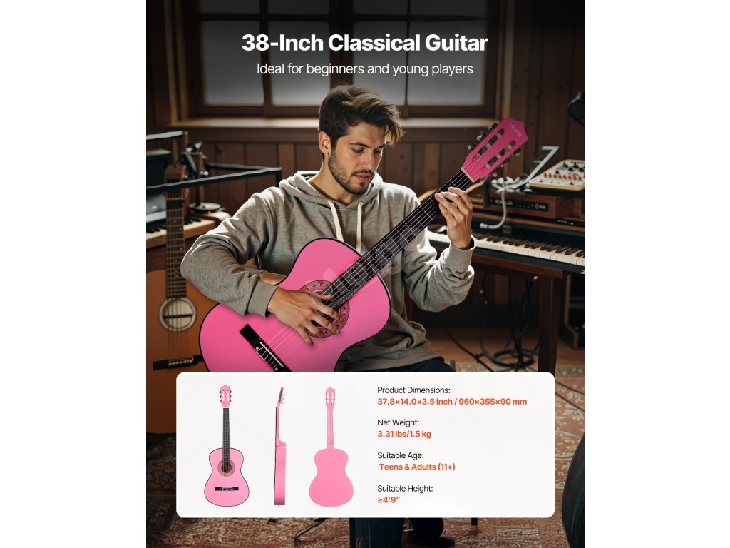 Odpověď: Nabízíme klasické kytary o velikosti 30", 36" a 38", které jsou vhodné pro hráče všech věkových kategorií: 38" Full-Size: pro dospělé a dospívající od 175 cm.Velikost 36": pro děti ve věku 7-11 let, výška 4'3"-4'11".Velikost 30": pro mladší děti ve věku 4-7 let, výška 3'7"-4'3".