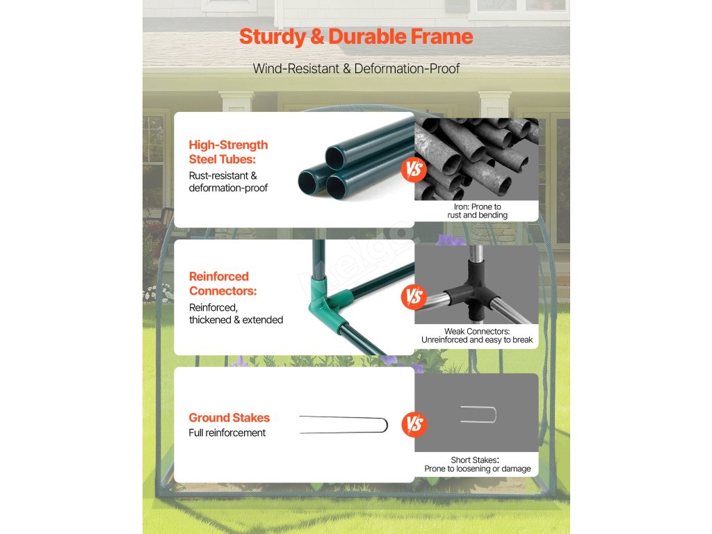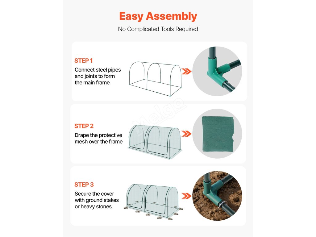 Tento stan na ochranu rostlin zahrnuje několik způsobů fixace. Kolíky ukotví rám v základně, rozšířené okraje lze zatížit, vestavěné popruhy mohou klec připevnit k ocelovým trubkám. Toto všestranné upevnění zajišťuje, že celá konstrukce je pevná jako skála i při silném větru.