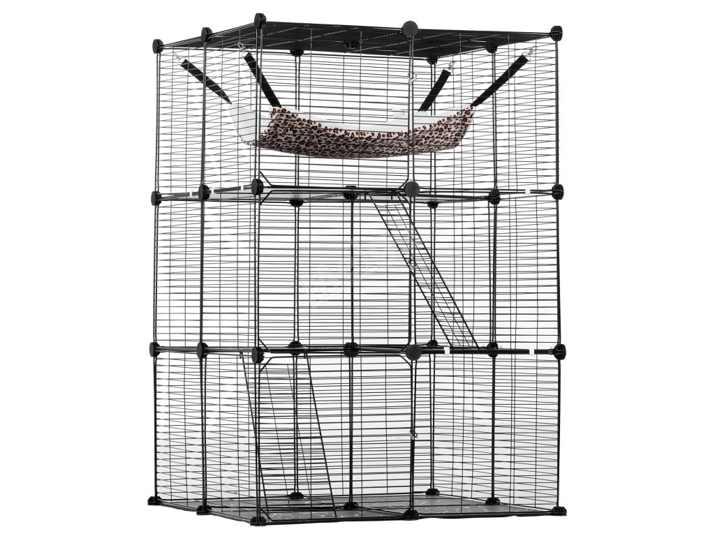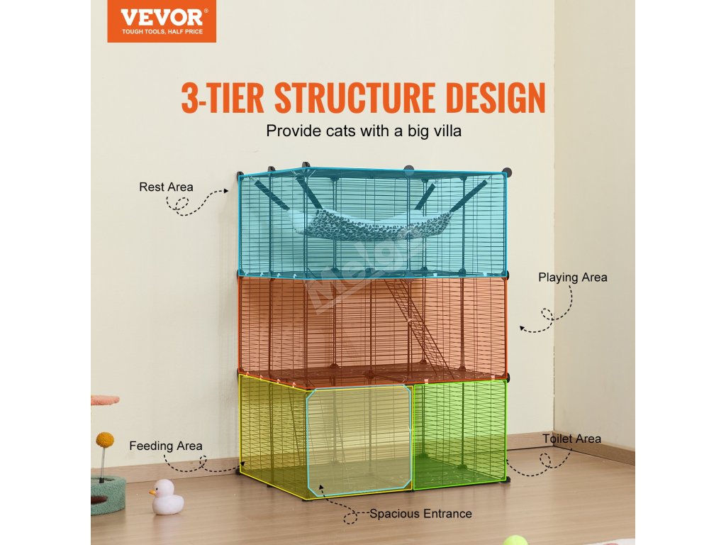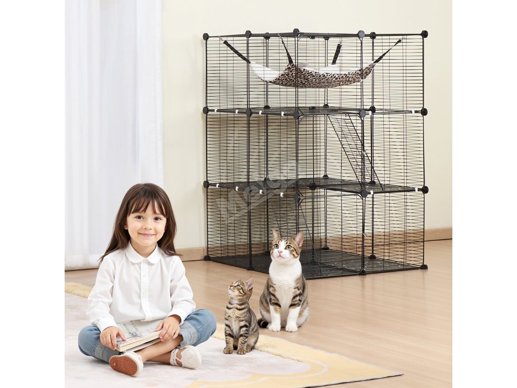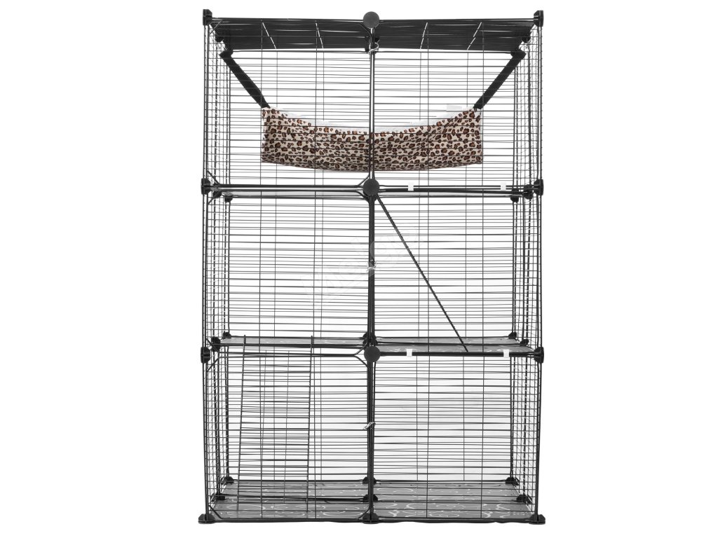 Tříúrovňová konstrukce klece pro kočky umožňuje rozdělit klec zvlášť na prostor pro krmení, odpočinek a hraní. Její prostorný interiér dokáže uspokojit každodenní potřeby vaší kočky a vytváří skvělé hřiště pro vašeho energického chlupatého přítele ve všech fázích života.
