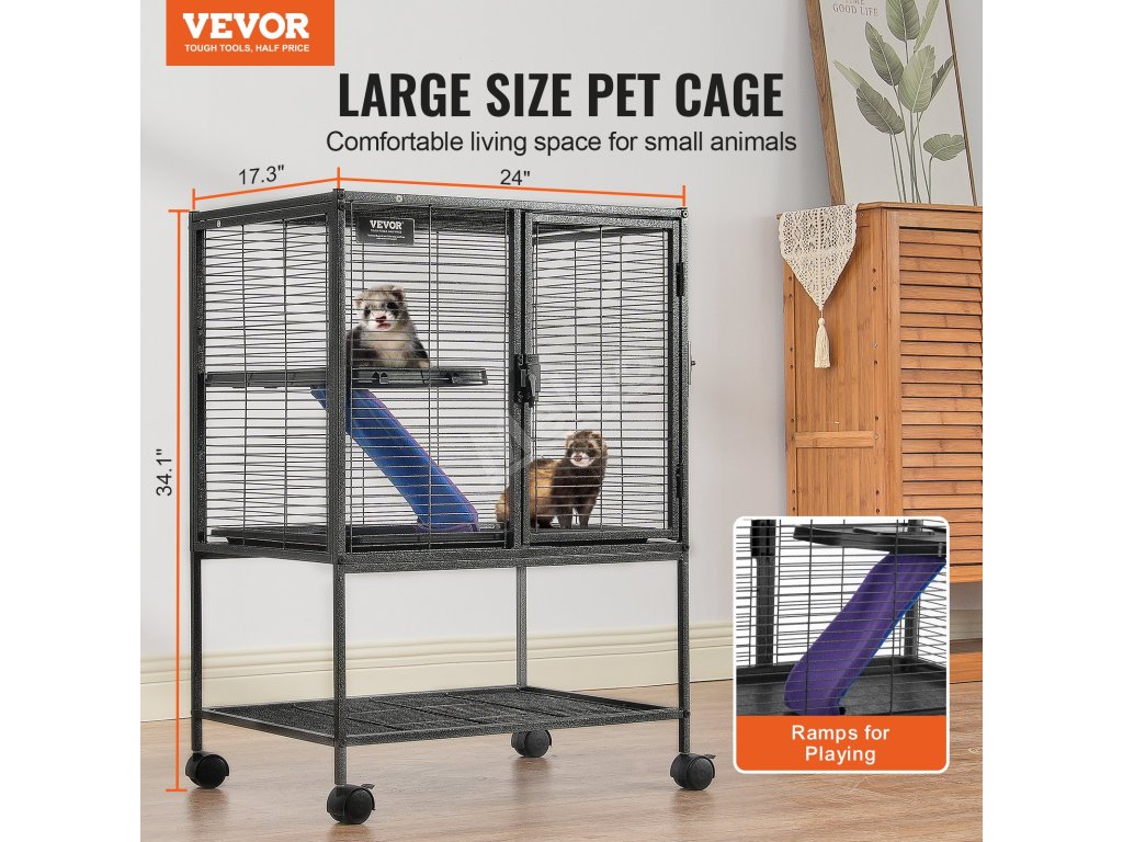Tato prostorná klec pro domácí mazlíčky o rozměrech 24 "x17,3 "x34,1" má dvě plošiny v různých výškách a protiskluzovou rampu. Nabízí vašim domácím mazlíčkům dostatek životního prostoru a místa na hraní s maximálním komfortem.
