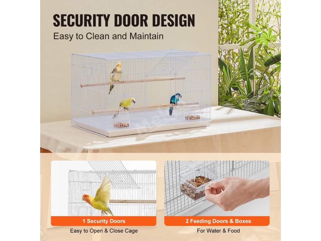Hlavní dvířka jsou vybavena bezpečnými dvířky pro krmení, čištění a údržbu a zároveň zabraňují úniku ptáků. Konstrukce pomocných dvířek usnadňuje ošetřovateli přidávání krmiva nebo výměnu pitné vody, aniž by musel klec zcela otevřít.
