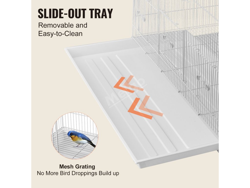 Vodotěsná spodní posuvná přihrádka je odnímatelná a snadno se čistí. Mřížka zabraňuje tomu, aby domácí zvířata chodila přímo na exkrementy. Už žádné nahromaděné ptačí výkaly. Celkové čištění je jednoduché a pravidelné čištění a údržba zajišťují zdraví vašich domácích ptáků.