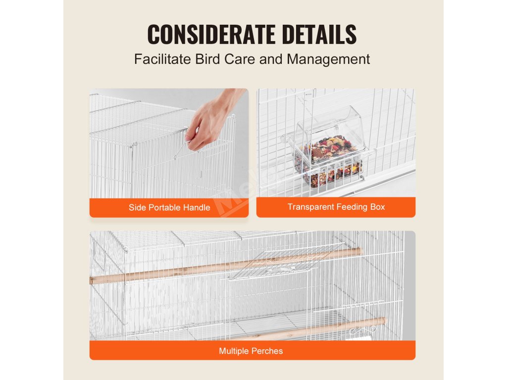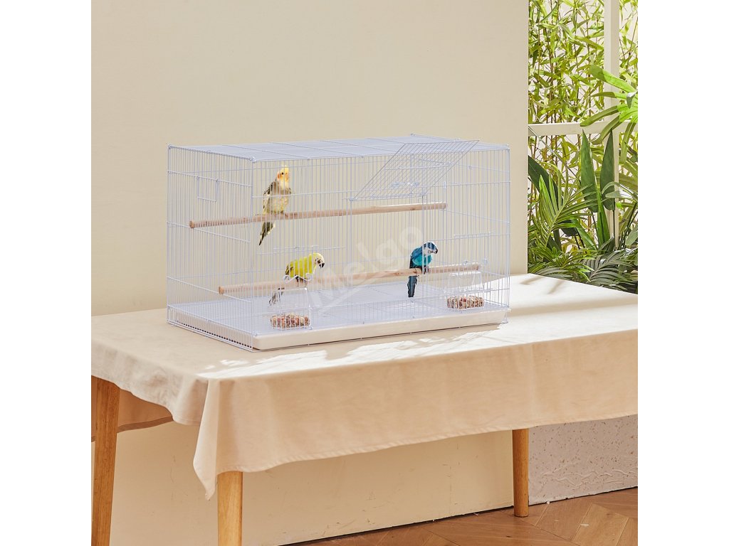 Tato klec pro ptáky je vybavena několika hnízdy, která umožňují domácím mazlíčkům odpočívat, stát nebo na nich skákat a simulují tak přirozené prostředí podporující relaxaci a odpočinek. Průhledný box na krmení uvnitř klece usnadňuje pozorování zbytků krmiva. Konstrukce s boční rukojetí usnadňuje přenášení klece.