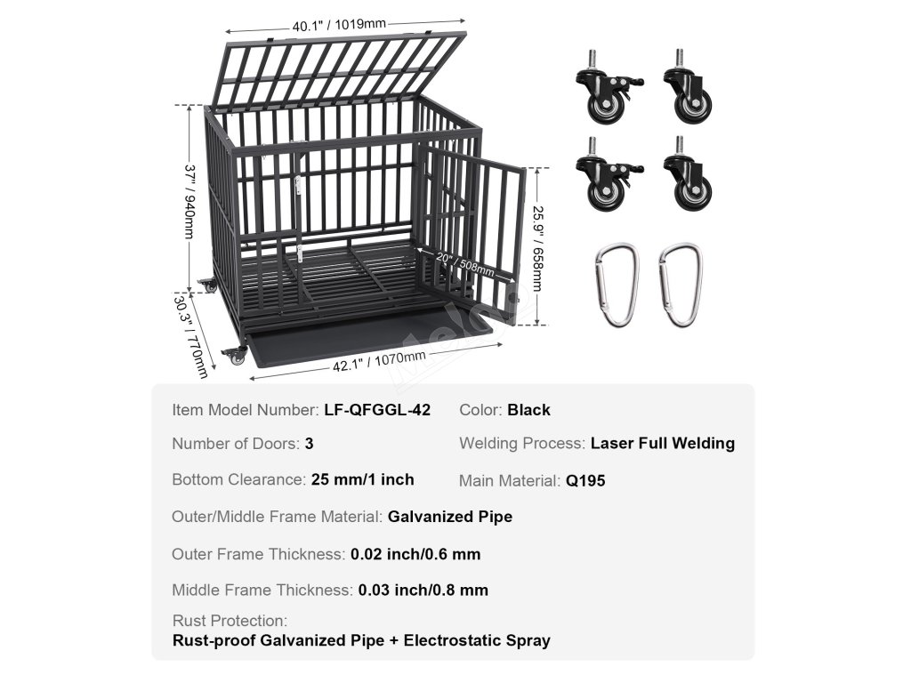 Naše přepravka pro psy je vyrobena z pozinkovaných ocelových trubek a opatřena elektrostatickým nástřikem, takže je odolná proti korozi a rzi a vydrží i venkovní použití. Díky maximální tloušťce trubky 0,03" zůstává odolná vůči kousnutí domácím mazlíčkem a zajišťuje dlouhotrvající výkon.