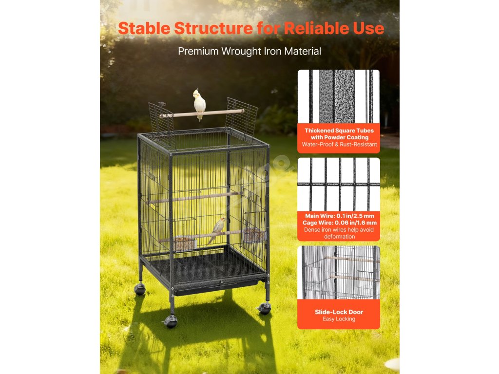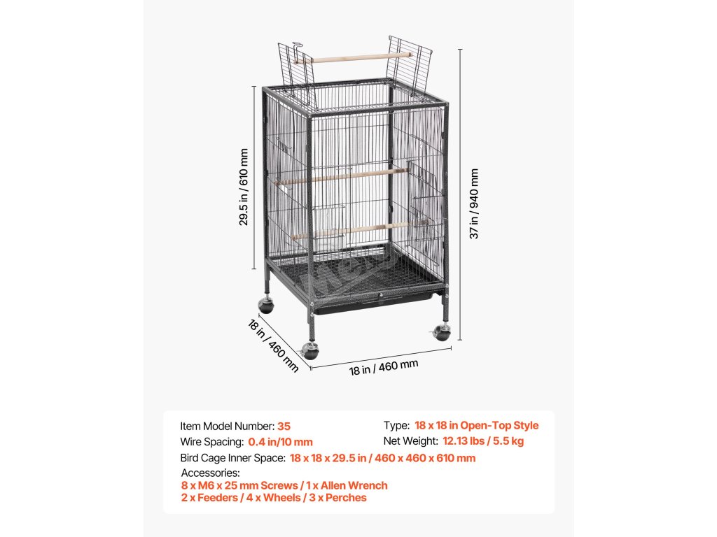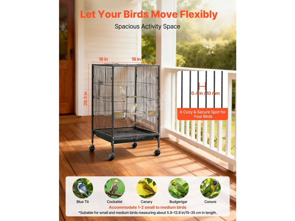 Tato ptačí klec o rozměrech 18 x 18 palců s roztečí prutů 0,4 palce poskytuje dostatek prostoru pro aktivity konur, holubů, slepic, kanárů a dalších ptáků.