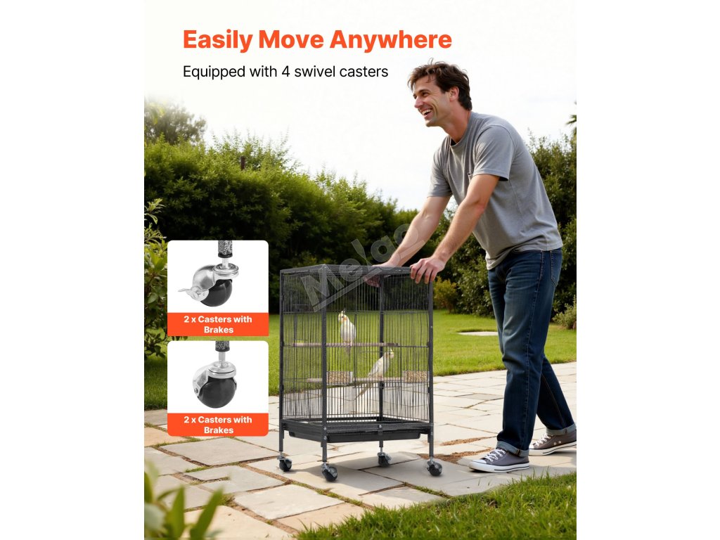 Naše klec pro papoušky je vybavena 4 robustními kolečky, díky nimž se hladce kutálí a lze ji snadno kamkoli přemístit. Posuvný zásobník se snadno vytahuje a čistí a mřížka odděluje domácí zvířata od odpadu, aby se v něm nehromadil trus, a udržuje tak čistotu a svěžest.