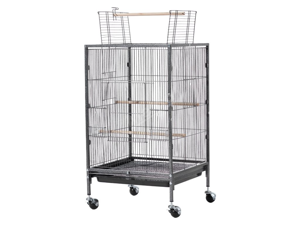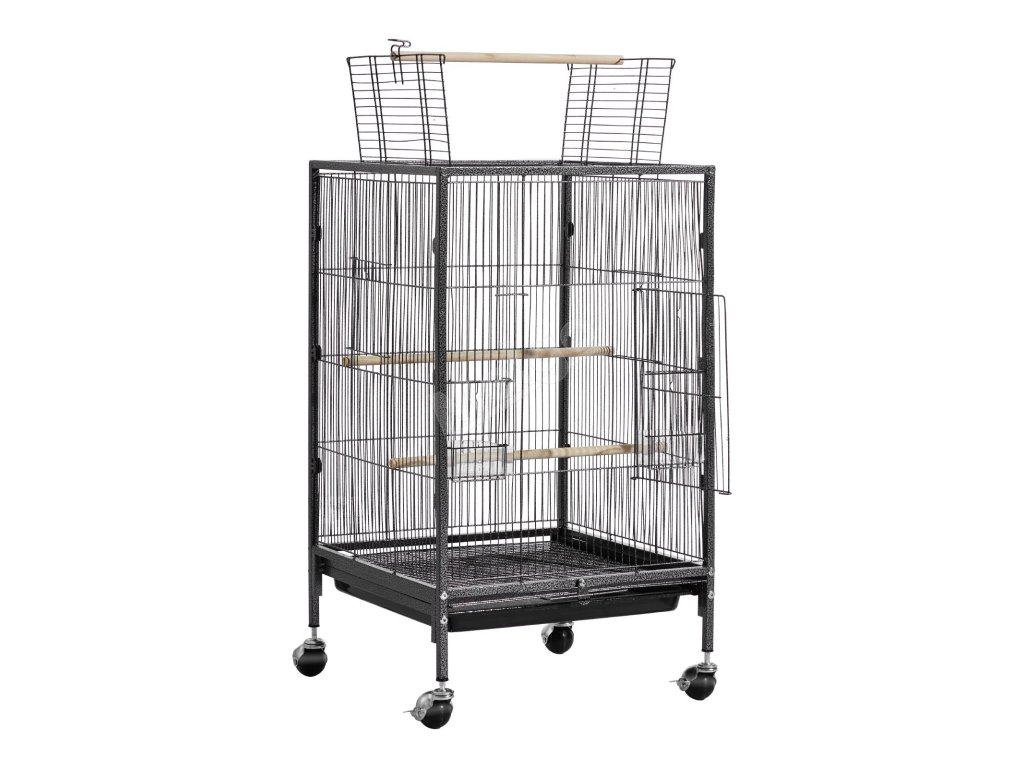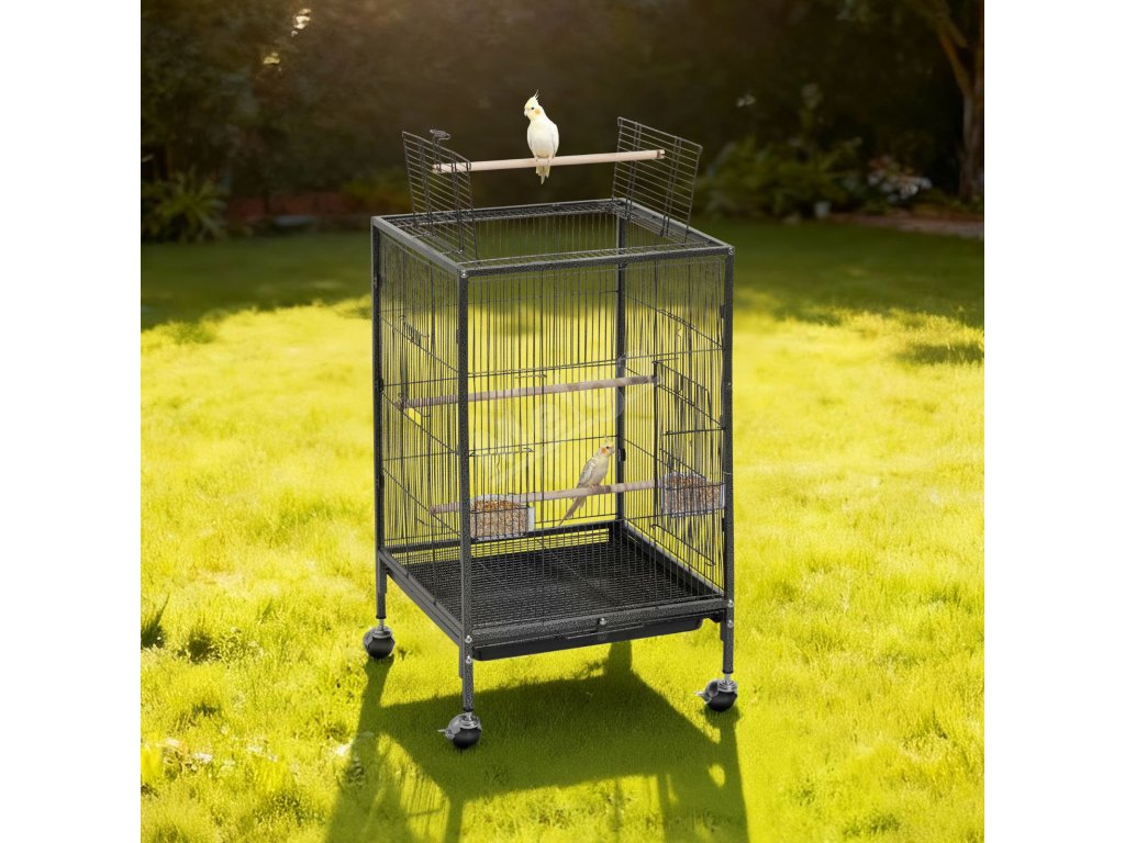 Klec pro ptáky 460×460×770 mm kovová, otevřený vrch, podnos a misky