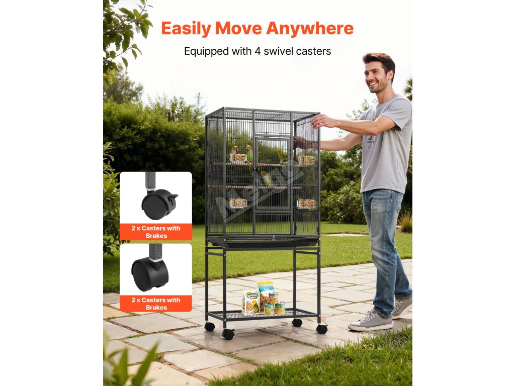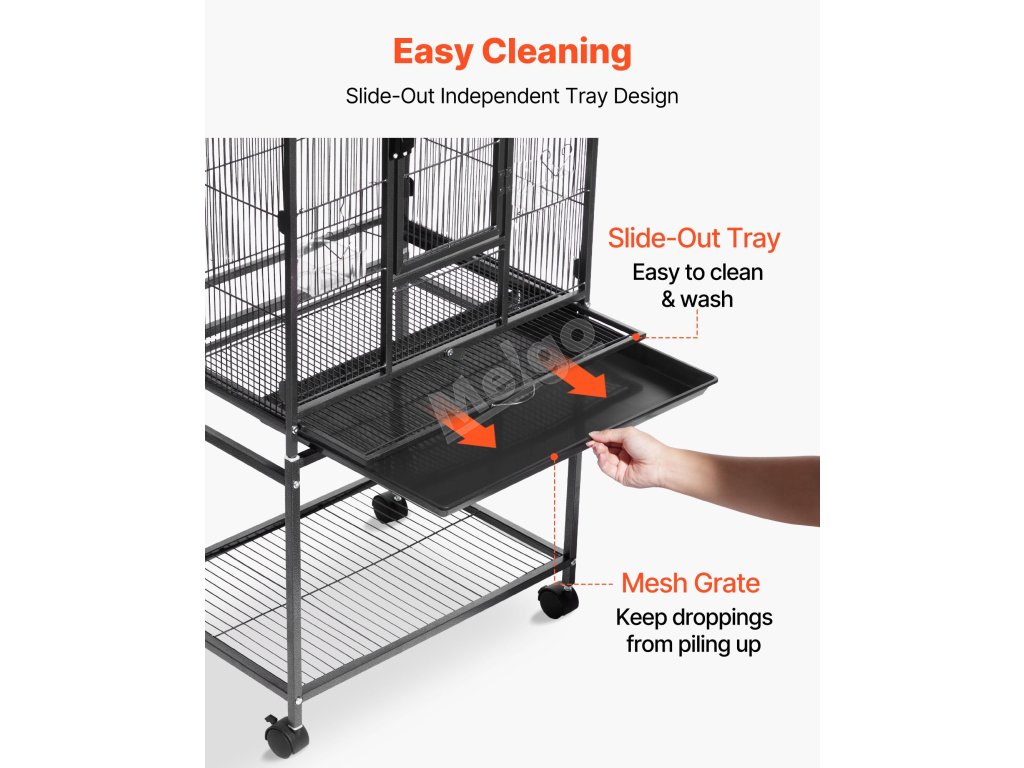 Naše klec pro papoušky je vybavena 4 robustními kolečky, díky nimž se hladce kutálí a lze ji snadno kamkoli přemístit. Posuvný zásobník se snadno vytahuje a čistí a mřížka odděluje domácí zvířata od odpadu, aby se v něm nehromadil trus, a udržuje tak čistotu a svěžest.