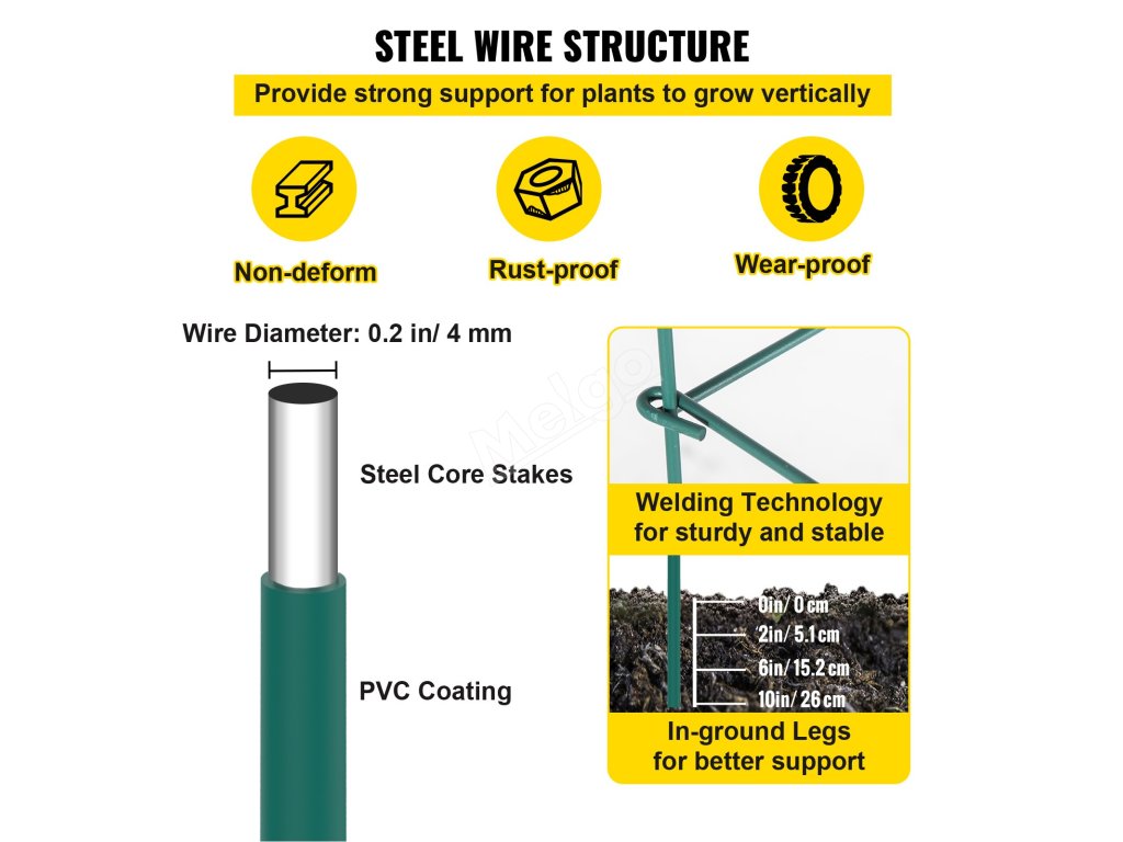 Dodává se s 10 sadami třípatrových klecí, velikost každé sady je 11,8" D x 11,8" Š x 16,1" V / 30 x 30 x 117 cm, včetně 10"/26 cm nohou. Max. 59.1"/ 150 cm vysoká rostlina může stabilně stát i v půdě.