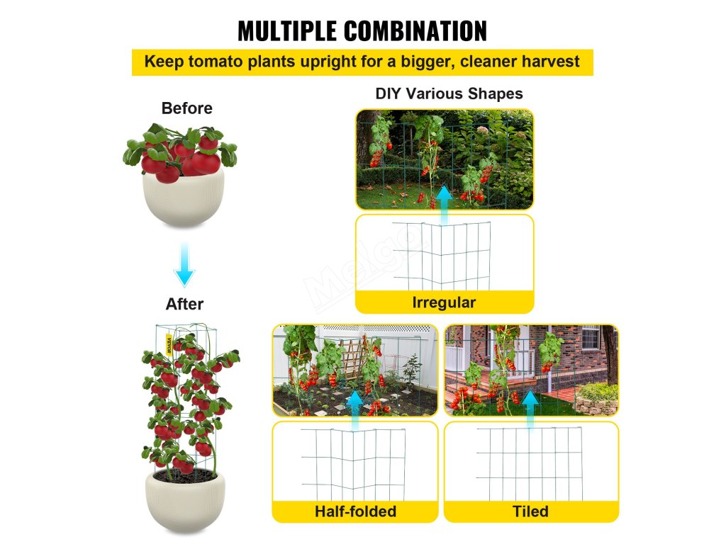 Skládací klece na rajčata lze sestavit do různých tvarů, aby vyhovovaly vašim různým potřebám. Při instalaci klecí nepravidelných, napůl složených a plochých tvarů věnujte pozornost hloubce nohou v zemi.