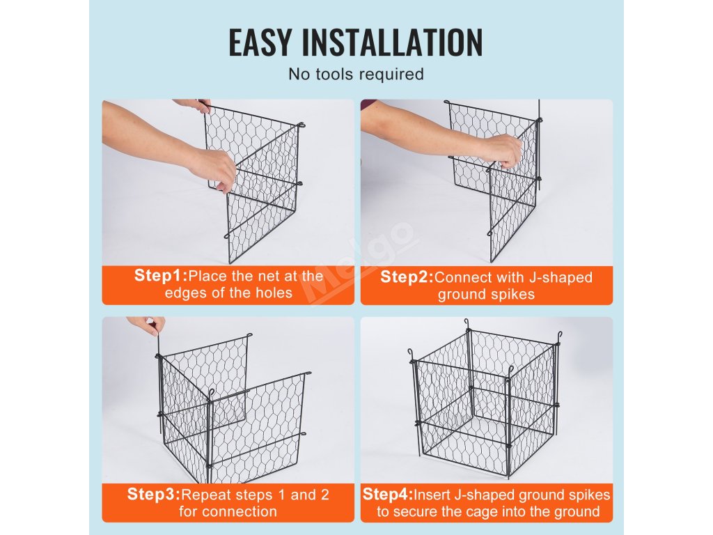 Zahradní klec se snadno sestavuje pomocí přiložených černých zipů, které spojují kovové pletivo. Pokud ji nepoužíváte, lze ji snadno demontovat a uskladnit, čímž ušetříte místo.
