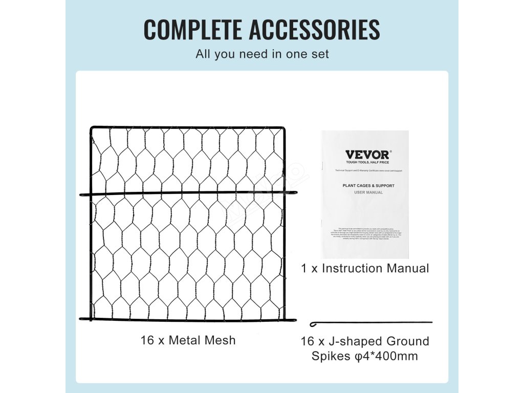 Sada na ochranu rostlin z pletiva obsahuje 16 kusů kovového pletiva, 16 kusů zemních hrotů ve tvaru písmene J (φ4*400 mm) a návod. Každá součást je jemně kovaná pro zajištění tvrdosti a odolnosti proti korozi, což zaručuje dlouhou životnost.