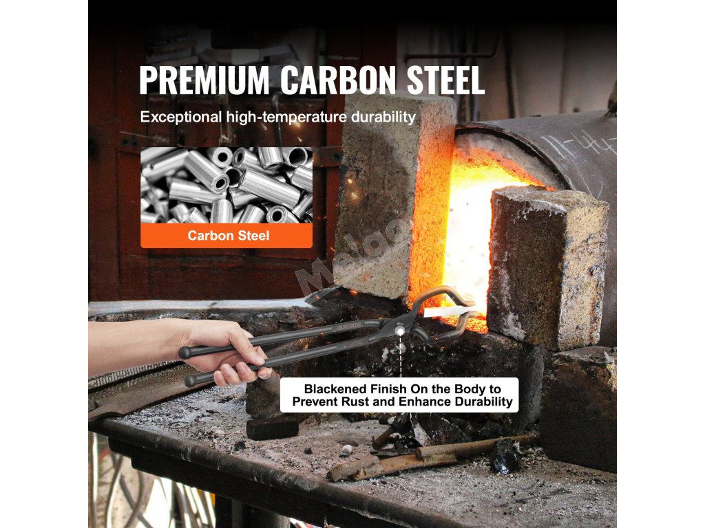 Naše kovací kleště jsou vyrobeny z vysoce kvalitních materiálů. Nýtovaná část z oceli A3 zaručuje delší životnost. Hlavní tělo je vyrobeno ze žáruvzdorné uhlíkové oceli, která zvyšuje odolnost. Povrch je navíc upraven tak, aby se zabránilo korozi.