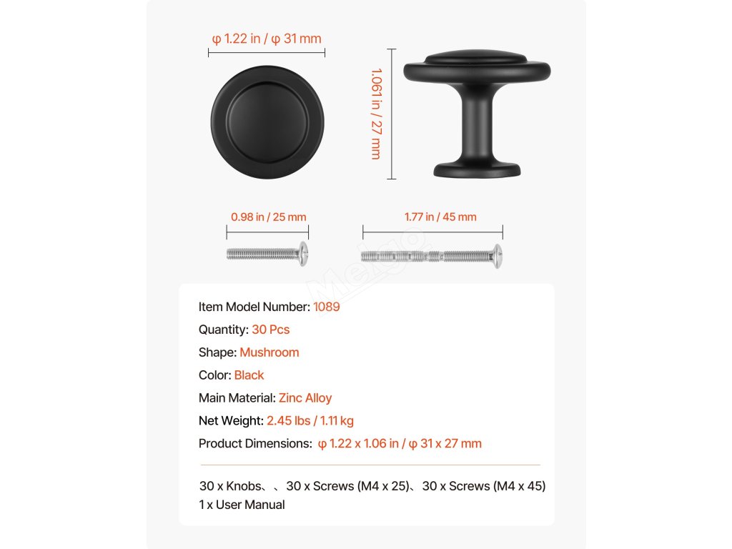 Knoflíky do skříní 30 ks, 31 mm, černá slitina zinku, se šrouby