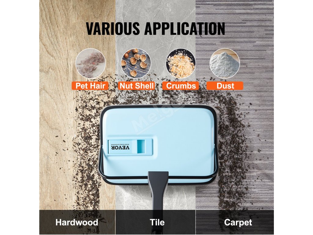 Náš ruční podlahový zametač bez námahy přitahuje a rychle sbírá nečistoty, drobky, sklo, prach, zvířecí chlupy a další nečistoty při kontaktu s jakýmkoli povrchem včetně koberců, předložek, tvrdých podlah a dalších.